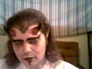 The eyebrows and eye shadowing are black lipstick, which is my best friend when I'm doing demon makeup. :) It's easily applied, and easily smudged to whatever dispersal you prefer. Keep in mind that this is all against green, so it looks much better then than it does in the pictures.